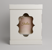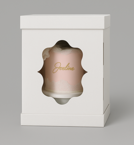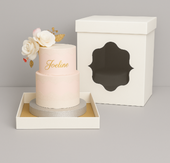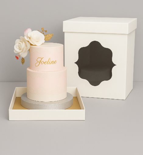 Intérieur de la boîte à gâteau en carton ondulé blanc naturel, avec un présentoir en plastique transparent.