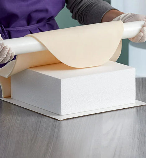• Bedecken Sie den Dummy zuerst mit Piping Gel oder Crisco, bevor Sie ihn mit ausgerolltem Fondant oder Marzipan bedecken.